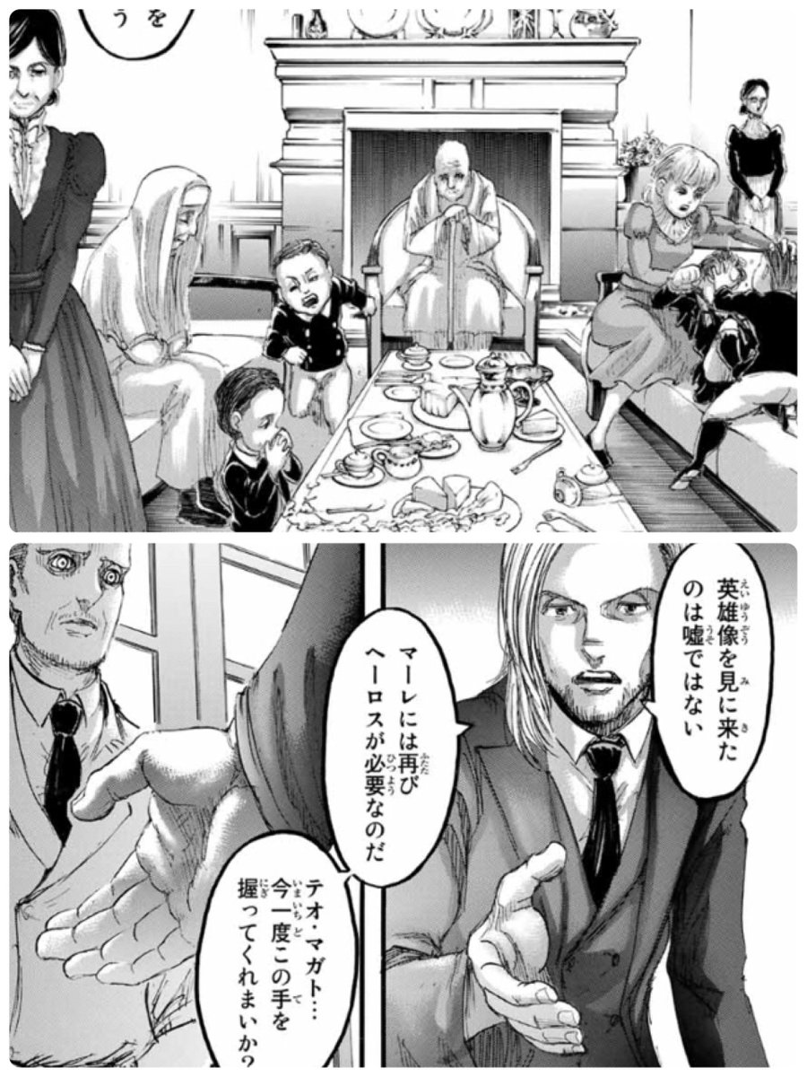 進撃の巨人 100話のネタバレは、ヴィリーとマガトが馬車の中で密会しているところから始まります。 99話のネタバレは、ヴィリーの演説の途中で終わったので、時間は少し戻っている感じですね。 ヴィリーとマガトの会話の要点はこんなところ どもども!ナガトです。 先週日曜にアニメ「進撃の巨人」The Final Season65話「戦鎚の巨人」が放送されました! TVアニメ「進撃の巨人」The Final Season第6話(第65話)「戦鎚の巨人」をご視聴いただいた皆様、ありがとうございました! 来週の放送もお楽しみに!! Illustration:佐野誉幸(巨人設定エレンの持つ始祖の巨人の力を 壁内から奪還するべく 宣戦布告します。 その宣戦布告をする大事な役目を担ったのが ヴィリー・タイバーです。 この世界に向けて発信された 演説シーンはまだ アニメ化もされていません。 ヴィリー・タイバーは